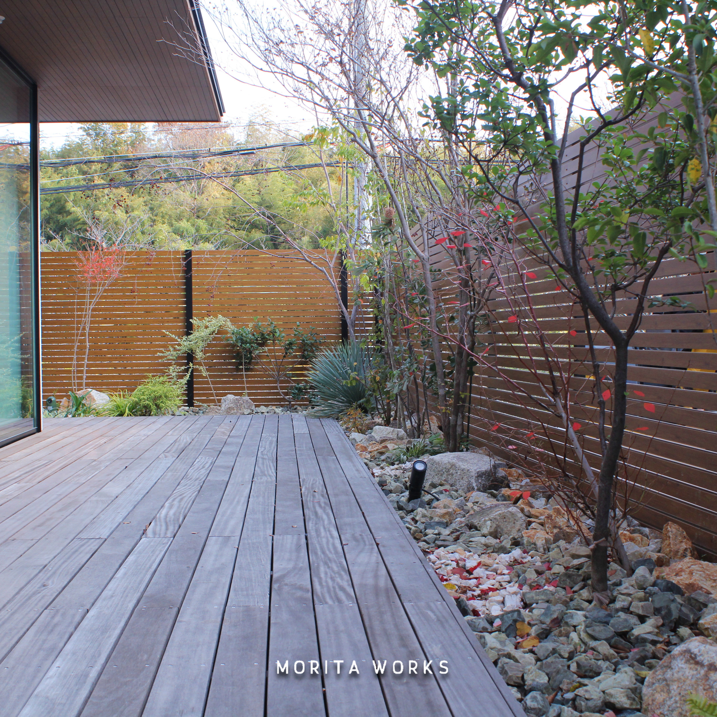 木目調のフェンスから背の高い植栽が覗く個性的なお庭