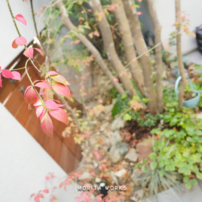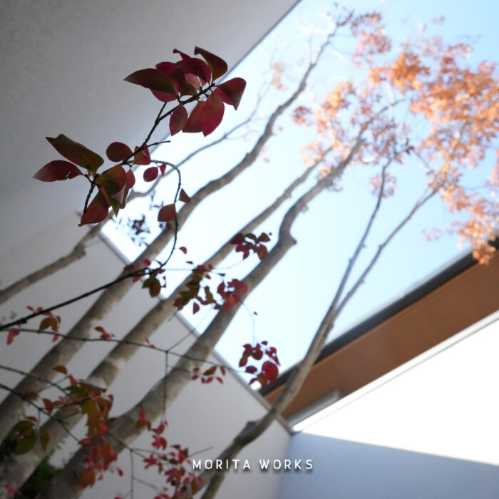 空と木々が織りなす アートの中庭 大阪府 住まいの内側から見上げる空と、ダイナミックに伸びる木々の姿が、まるで一枚の絵画のような中庭です。 限られた空間だからこそ、自然光を最大限に取り込み、季節の移ろいを肌で感じられる設計にこだわりました。 鮮やかな赤みを帯びた葉が、白を基調とした空間に美しいアクセントを与えています。家の中にいながらにして、自然の息吹を感じられるこの中庭は、忙しい日常に「ふっ」と立ち止まる癒しの時間をもたらしてくれます。 視線が抜ける開放的な空間で、四季折々の風景を独り占めしてみませんか?